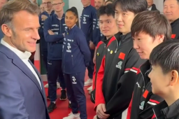 马克龙与王楚钦孙颖莎打乒乓球