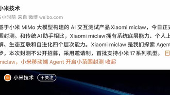 9.5GB!小米澎湃OS3深度更新,国内首个手机智能体miclaw上线